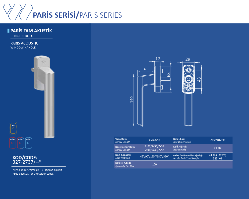 Palet Üstü Adedi & Ağırlığı (No. on Palettes & Weight) 24 Koli (Boxes) 525 KG